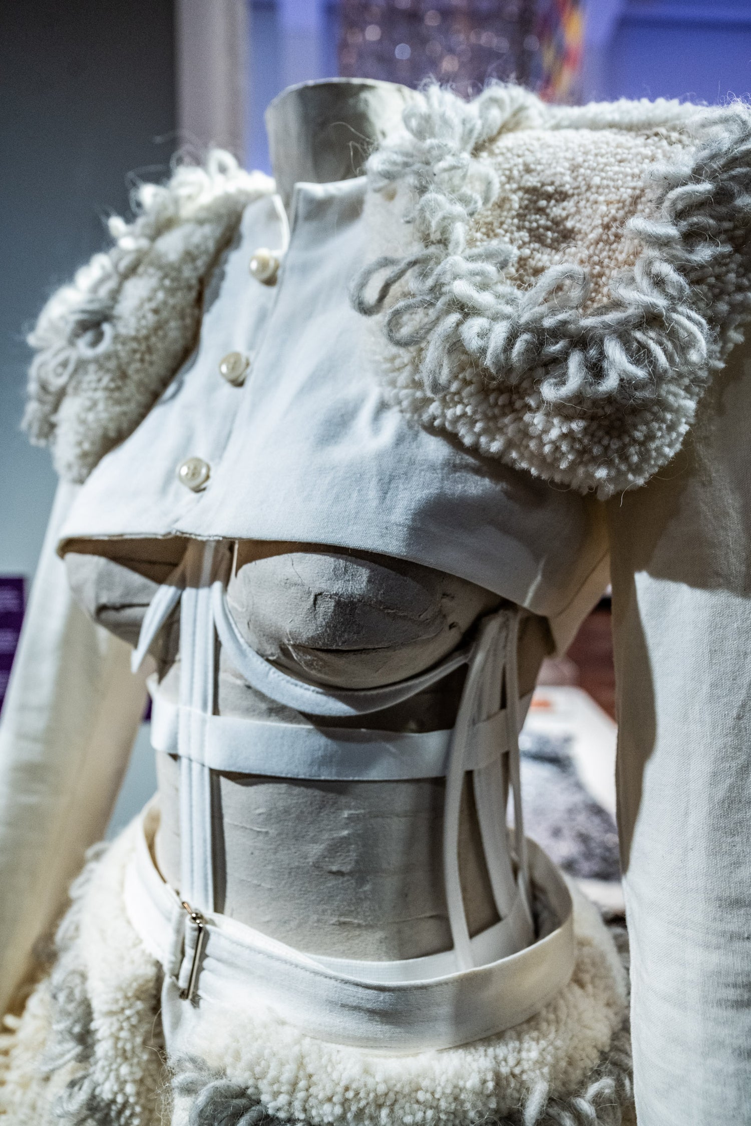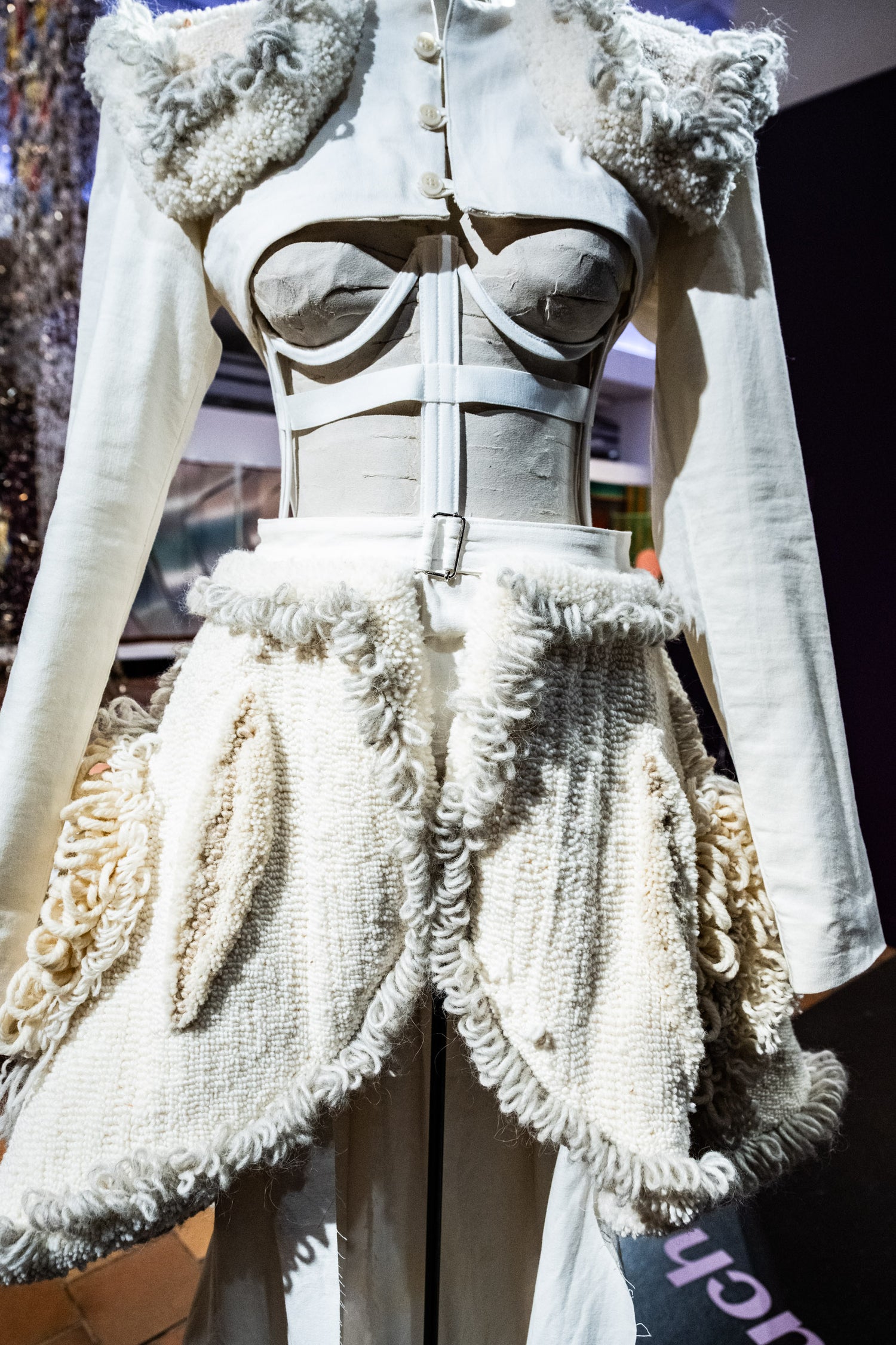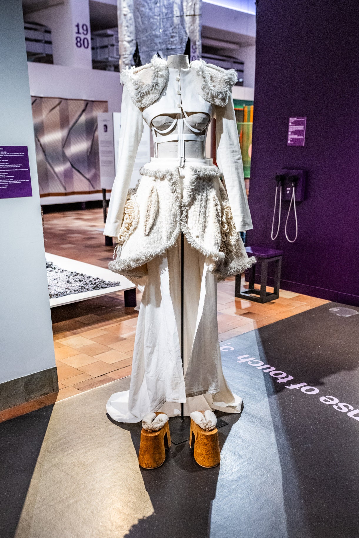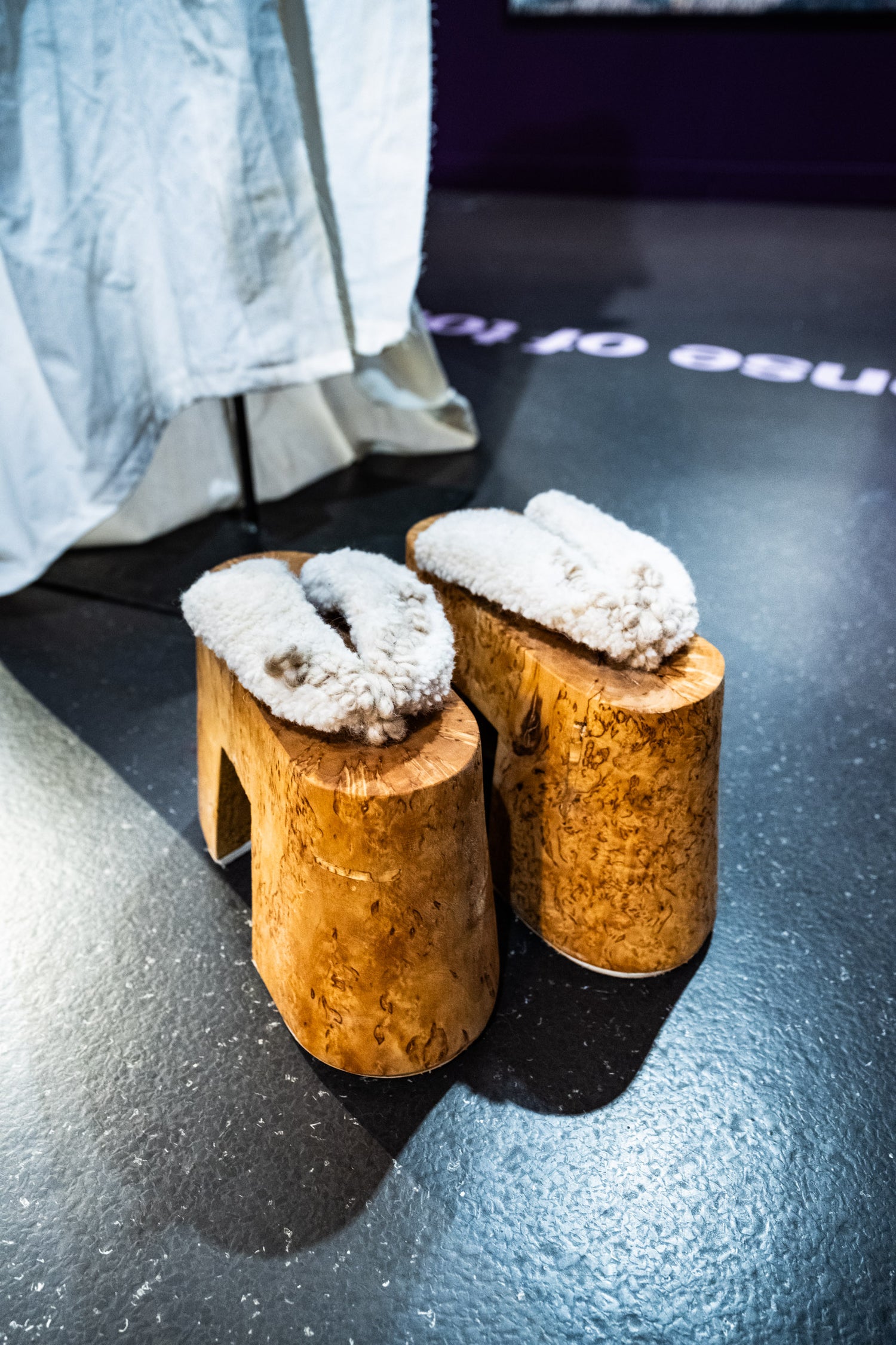 Stoff aus einer Performance in der Lilly Keller Stiftung, getuftete Wolle aus dem Bestand von Lilly Keller, Holz
