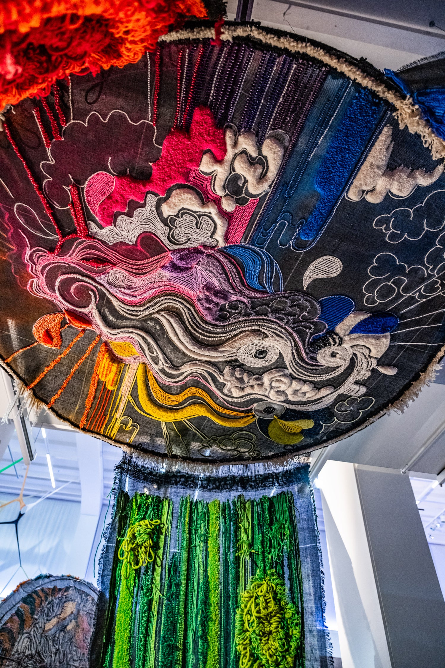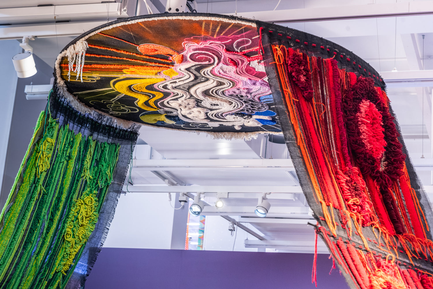 Getuftete Schafwolle, Wolle aus dem Bestand von Lilly Keller, Glitzer, Spray, Acrylfarbe, Nachtleuchtfarbe auf Leinwand, Eisen