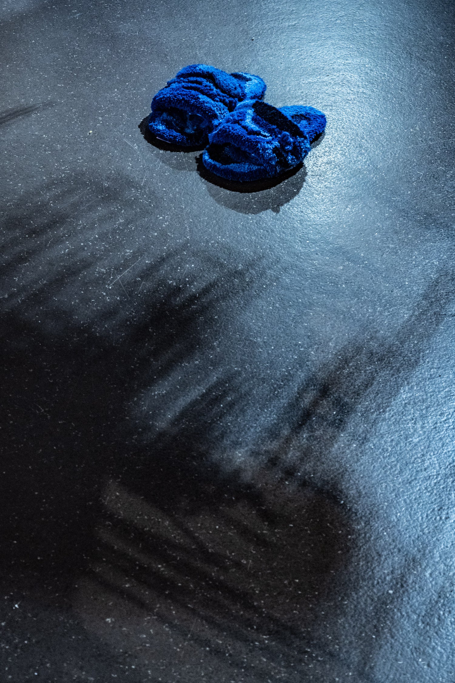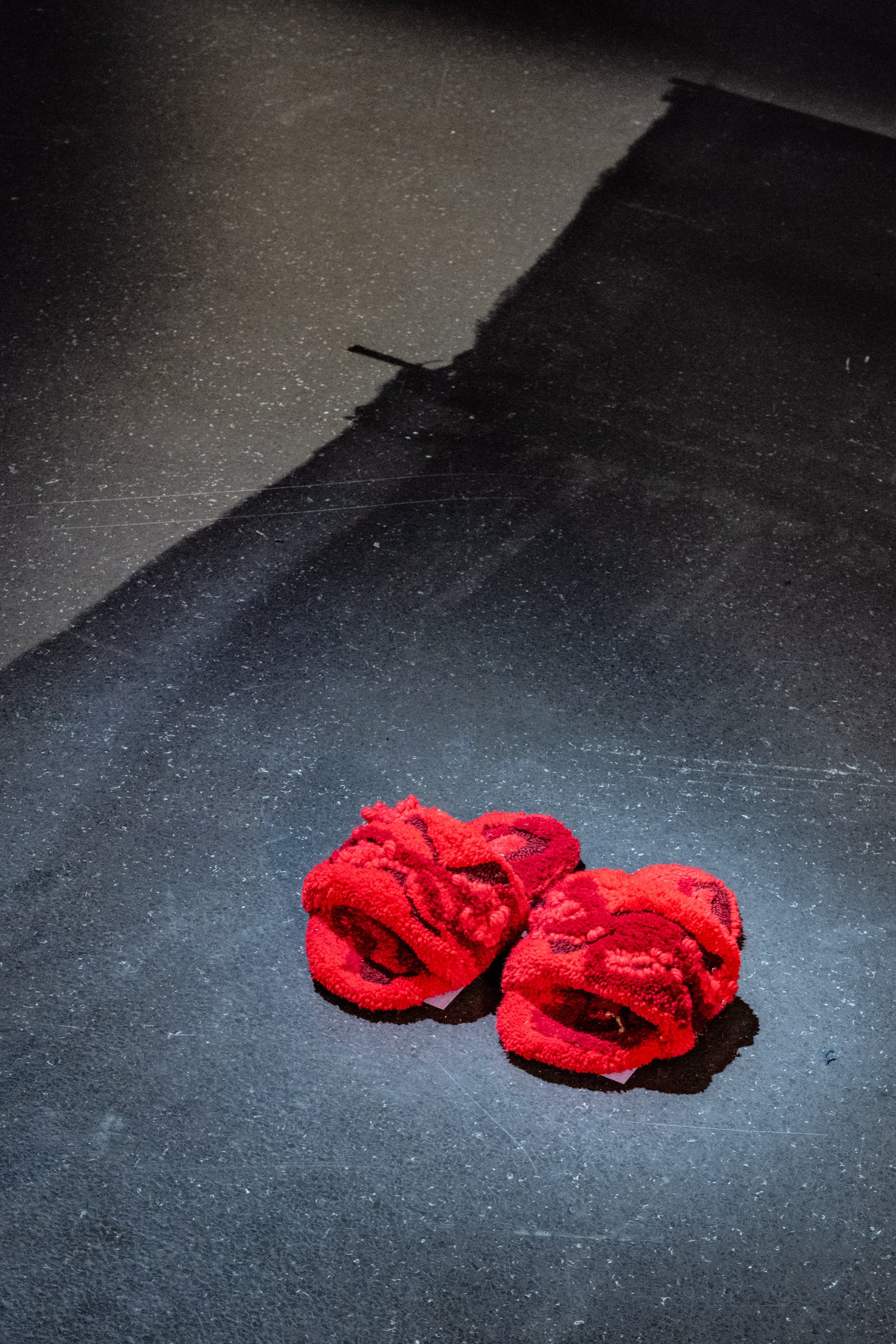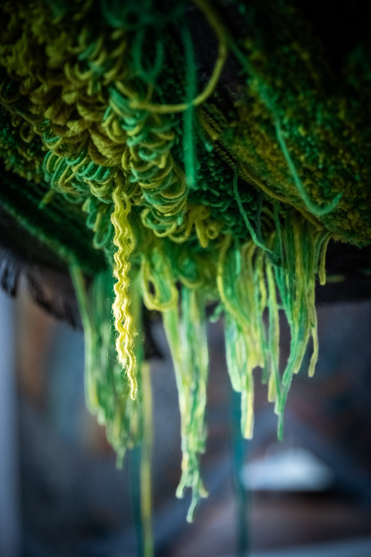 Getuftete Schafwolle, Wolle aus dem Bestand von Lilly Keller, Glitzer, Tusche, Acrylfarbe, Nachtleuchtfarbe auf Leinwand, Latex, Mikrophon, Soundpiece von Belia Winnewisser
